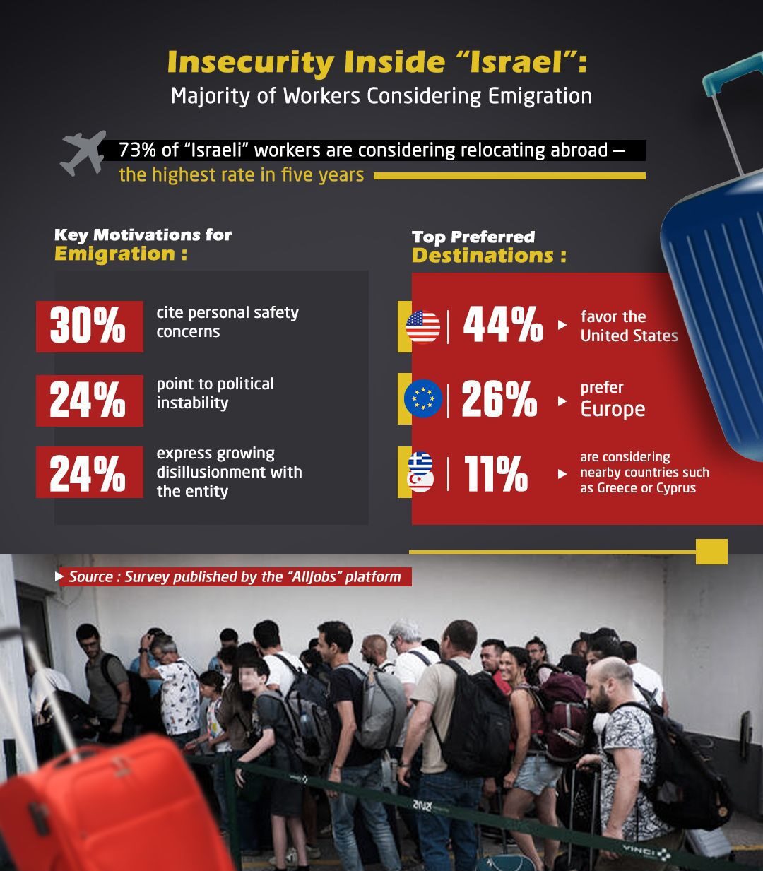 تحقیقی ادارے "آل جابز” کی تازہ رپورٹ کے مطابق، 73 فیصد “اسرائیلی” ملازمین بیرونِ ملک نقل مکانی پر غور کر رہے ہیں — جو کہ گزشتہ پانچ برسوں میں بلند ترین شرح ہے۔
