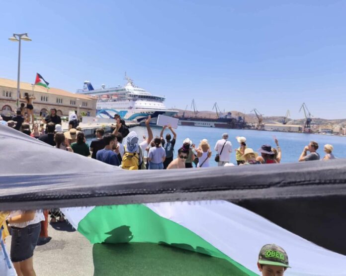 مانیٹرنگ ڈیسک (مشرق نامہ)– یونان کے سائکلادک جزیرے سیروس پر ۱,۶۰۰ اسرائیلی شہریوں کو لے کر آنے والے کروز شپ کراؤن آئرس کے مسافروں کو بحفاظت خدشات کے پیش نظر جزیرے پر اترنے کی اجازت نہیں دی گئی۔ جزیرے پر ۳۰۰ سے زائد مظاہرین نے اسرائیل کی جانب سے غزہ میں جاری جنگ اور فلسطینیوں کے ساتھ اس کے سلوک پر شدید احتجاج کیا اور "نسل کشی بند کرو” کے الفاظ پر مشتمل بینر کے ساتھ فلسطینی پرچم بلند کیے۔