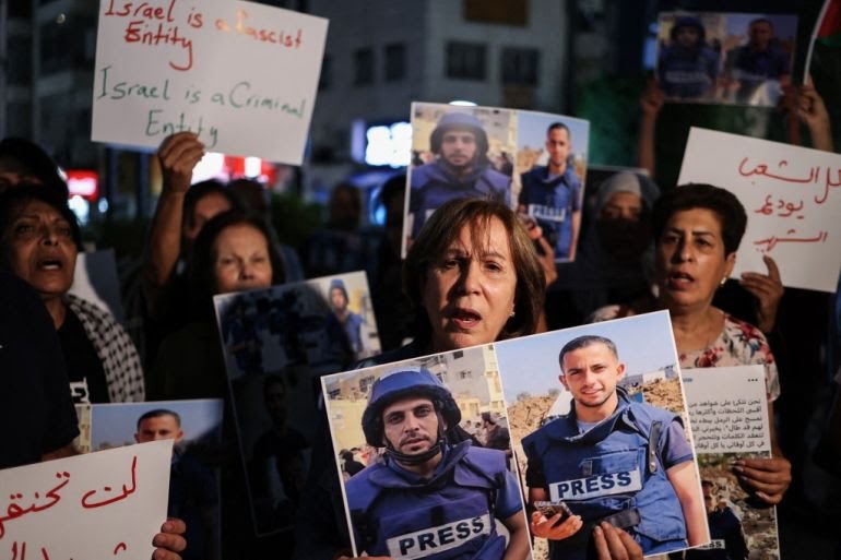 الجزیرہ کے رپورٹر انس الشریف اور محمد قرقہ، کیمرہ مین ابراہیم زاہر، محمد نوفل اور مؤمن علیوہ، نیز صحافتی پلیٹ فارم ساحت کے صحافی محمد الخالدی کو اتوار کی شام غزہ شہر میں الشفاء اسپتال کے باہر ان کے خیمے پر اسرائیلی افواج کے ایک جان بوجھ کر کیے گئے حملے میں شہید کر دیا گیا۔