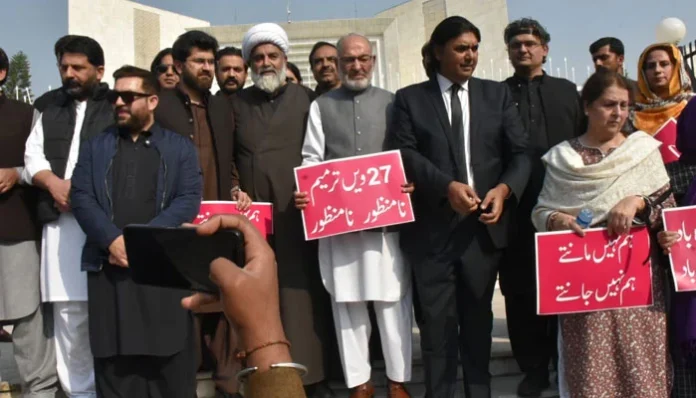 اسلام آباد(مشرق نامہ): مشترکہ حزبِ اختلاف کے بلاک تحفظِ آئین پاکستان (ٹی ٹی اے پی) نے حال ہی میں منظور ہونے والی 27ویں آئینی ترمیم کے خلاف منگل کو احتجاجی مارچ کیا، جو پارلیمنٹ ہاؤس سے سپریم کورٹ تک پہنچا، جسے رہنماؤں نے ملک کے آئین کے دفاع کی علامتی کوشش قرار دیا۔