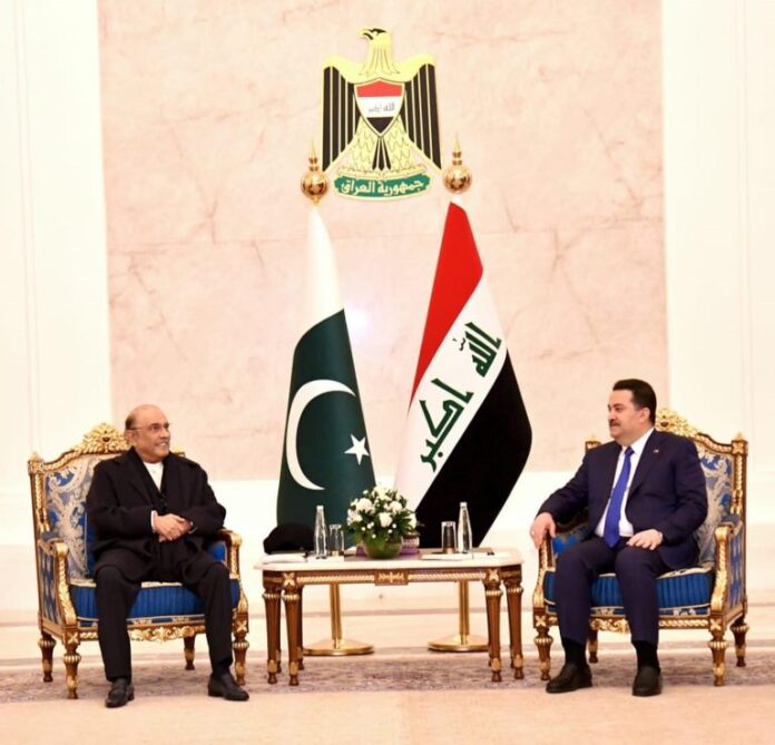 بغداد (مشرق نامہ) – صدرِ مملکت آصف علی زرداری نے اتوار کے روز گورنمنٹ پیلس میں عراق کے نگراں وزیراعظم محمد شیاع السودانی سے ملاقات کی، جس میں دوطرفہ تعاون کو مزید گہرا کرنے اور باہمی دلچسپی کے ترجیحی شعبوں میں عملی اقدامات پر تفصیلی تبادلۂ خیال کیا گیا۔