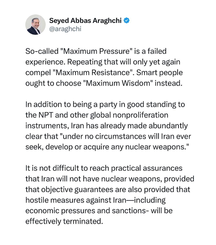 "نام نہاد ‘زیادہ سے زیادہ دباؤ’ ایک ناکام تجربہ ہے۔ اس کو دہرانا ایک بار پھر ‘زیادہ سے زیادہ مزاحمت’ کو لازم کر دے گا۔ عقل مند افراد کو اس کے بجائے ‘زیادہ سے زیادہ حکمت’ کا انتخاب کرنا چاہیے۔”