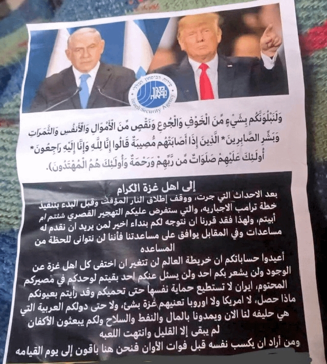 رپورٹس کے مطابق، ان پمفلٹس میں اسرائیلی وزیر اعظم بینجمن نیتن یاہو اور امریکی صدر ڈونلڈ ٹرمپ کی تصاویر شامل ہیں، جنہیں جمعرات کے روز غزہ کے عام شہریوں میں نفسیاتی خوف و ہراس پھیلانے کے مقصد سے تقسیم کیا گیا۔