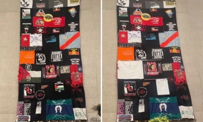 دی گارڈین کے مطابق، کینبرا میں جاری نمائش کے ایک بڑے ٹیپیسٹری پر موجود دو فلسطینی جھنڈوں کو سفید کپڑے سے چھپا دیا گیا ہے۔