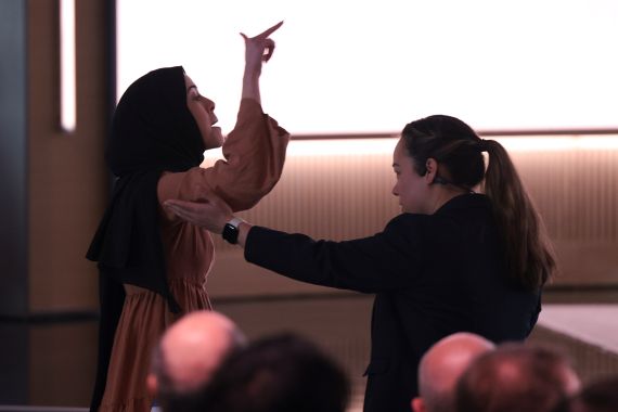 "مصطفیٰ، تمہیں شرم آنی چاہیے،” مائیکروسافٹ کی ملازمہ ابتہال ابوسعید نے اسٹیج کی طرف بڑھتے ہوئے پکارا، جس پر سلیمان نے اپنی تقریر روک دی۔